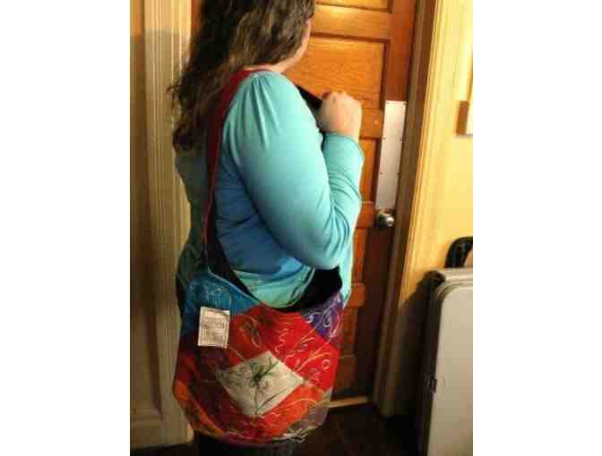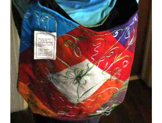 Nepali cotton shoulder bag – 15 in. high x 14 in. wide; patchwork design with embroidery and “inlaid” mirror; drawstring closure