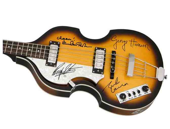 This is a brand new left handed hofner bass guitar (like Paul plays) featuring the facsimile/reproduction autographs of Paul McCartney, Ringo Starr, George Harrison and John Lennon!