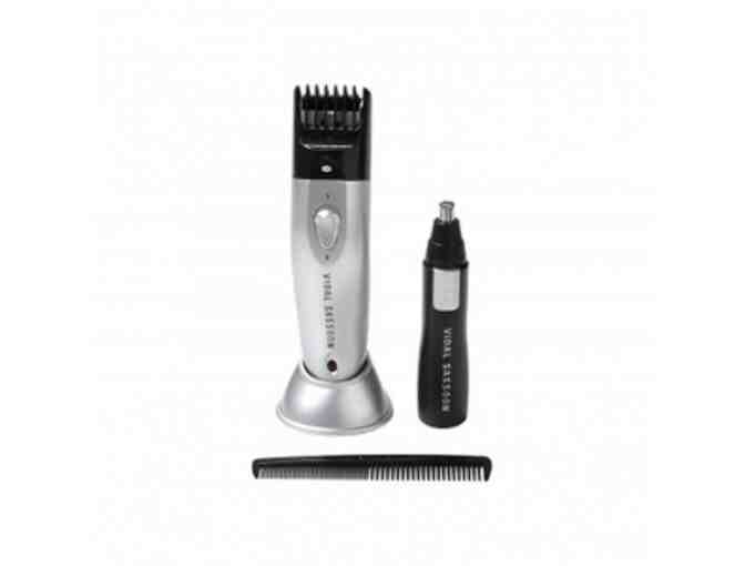 Vidal Sassoon Cord/Cordless Trimmer with Groomer has a full-size trimmer with a 5-position cutting guide. It is a personal groomer with barber shears and a barber comb. There is also a cleaning brush. It comes with attachments and storage stand. There is a silver and black finish.