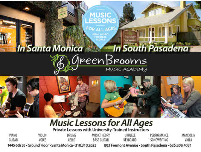 Gift certificate for one month (4 lessons) of private instruction at Green Brooms Music Academy in Santa Monica or Pasadena. Certificate includes registration fee. Expires 02/09/15