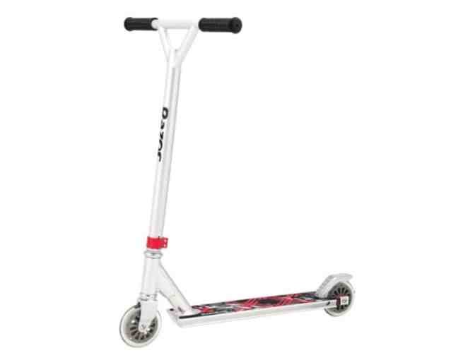 Your kids will have a blast on this Razor ProXX Sport Scooter. It features a 22" adjustable handlebar height, 83 degree headtube angle, a double stacked headtube clamp, 14 spoke 110 mm urethane wheels, and freestyle rubber hand grips with full deck grip tape. The white, black, and red deck design is durable and super tough. Made for ages 8 and up. This item is Pick Up Only from Grace Christian School.