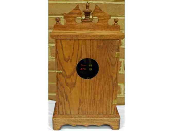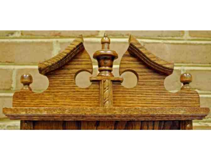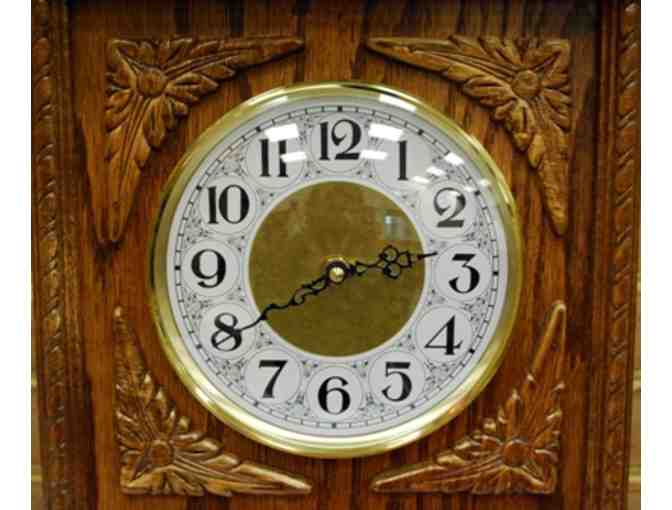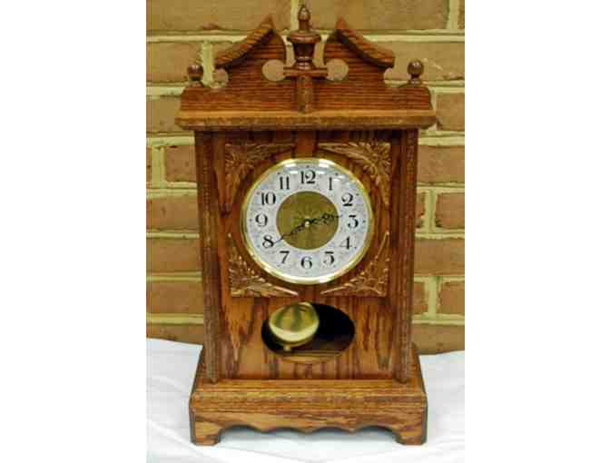 This beautifully handcrafted Oak Mantle Clock is the perfect addition to any room in your home. It is a Quartz movement, battery-operated clock with pendulum. Chimes are programmable and tone options are Westminster, Whittington melody or you can record your own personal chime. This clock was handmade especially for the GCS Online Auction by GCS Friends Blayne and Bradley Showalter. Clock measures 21"H x 11"W x 5"D. This item is Pick Up Only from Grace Christian School.