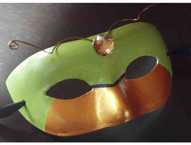 This superhero mask, decorated by Paws4ever Executive Director Laura Griest, features a lime and gold body with wire antennae.
