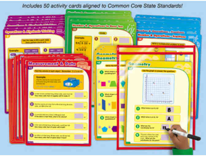 YOUR TAX-DEDUCTIBLE CONTRIBUTION PURCHASES THIS ITEM FOR OCS - THANK YOU! Perfect for independent practice, math centers, test prep and more, our ready-to-go practice cards are designed to support third grade Common Core State Standards! The cards are filled with self-checking activities that cover essential math skillsfrom fractions to geometry! Children just slide a card into the included write & wipe pocket, use a dry-erase marker to write the answers directly on the surface, then flip the card over to check their work!