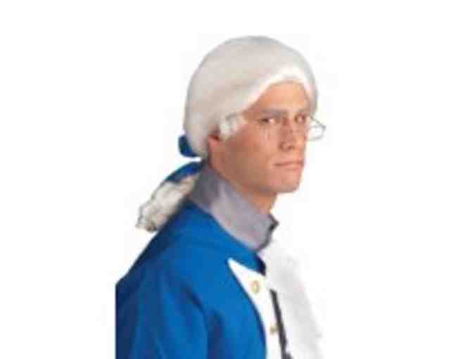 YOUR TAX-DEDUCTIBLE CONTRIBUTION PURCHASES THIS ITEM FOR OCS - THANK YOU! Walk in the shoes of an American Patriot in costume with our Historical Colonial White Wig. It features white synthetic hair styled for that of a mid 1700s men's powered wig with a few ringlet curls pulled into a ponytail tied off with a colored ribbon. It is a historical hairpiece great for topping off any George Washington, Ben Franklin, American colonial militia man or Paul Revere costume. The Colonial Historical White Wig will transform you into a hero from history.