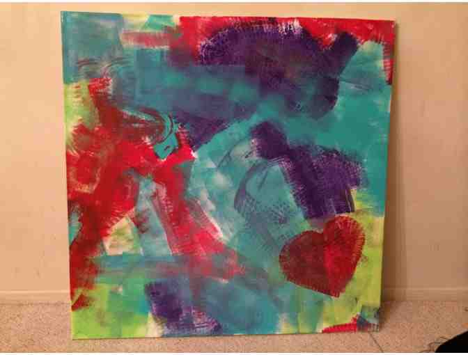 This piece of art was created by Kindergarten Students at OCS. The process was rollerpainting and the kids took turns adding colors to the canvas. Half of the proceeds will go to a charity.