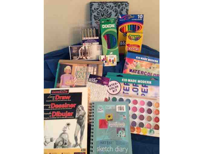 This Basket Includes: $10 Michael's Gift Card, General's Learn to Draw Sketch Set, 4 Getty the Villa Tickets, Photo Book, Dixon Pencils, Cra-Z-Art Markers- 1 box of ten, Crayola Crayons - box of 48, Kit's Paper Dolls, Alphabet Stickers, Watercolor Kit and Paper Tablet, Sketch Diary, Manga-Comic Pro Sketching Pens - set of 6