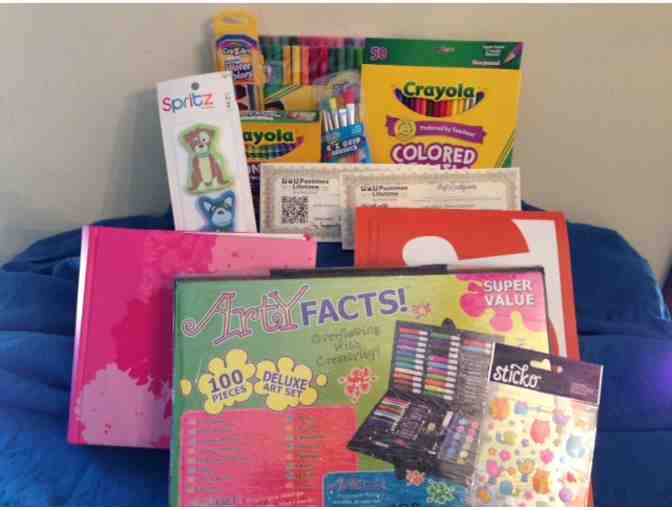 This Basket Includes: Water Colors(set of 8), Crayola Colored Pencils-box of 50, Crayola Thin Markers-set of 50, E-Z Grip Paint Brushes- 5 pack, Crayola Crayons- box of 64, 2- 1 hour Fine Art Class @ Pastimes for a Lifetime Art & Piano School, 2 Dog Erasers, Sketch Paper Pad, Photo Book, Arty Facts Deluxe Art Set- 100 pieces