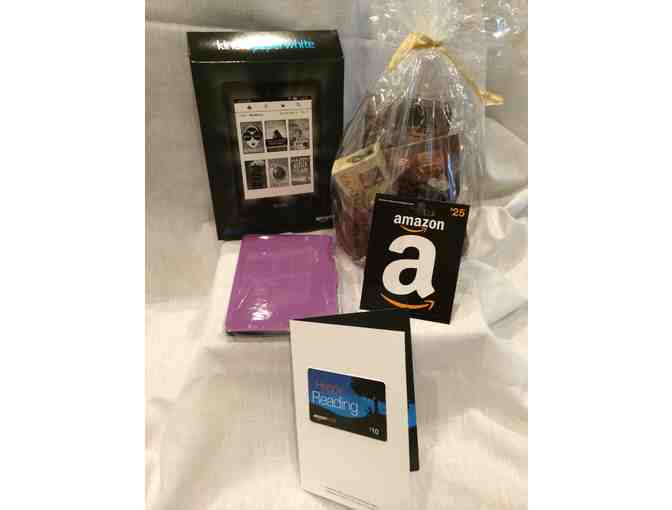 This Basket Includes: Godiva Mug and Chocolates, Kindle Paperwhite, Purple Case, $25 Amazon Gift Card, $10 Amazon Kindle Gift Card