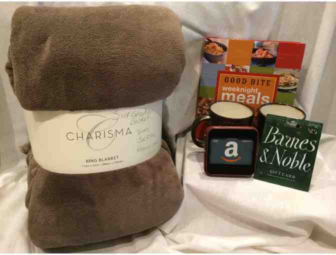 This Basket Includes: Charisma King Blanket, $100 Amazon Gift Card, 2 Threshold Mugs, "Good Bite Weeknight Meals" Cookbook, $25 Barnes and Noble Gift Card
