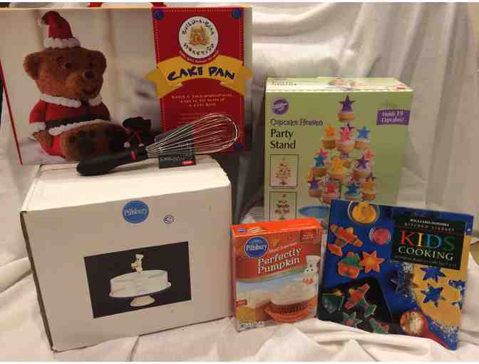 This Basket Includes: Build a Bear Cake Pan, Pillsbury Cake Plate, 11" Oxo Balloon Wisk, "Williams-Sonoma Kids Cooking" cookbook, Cupcake Heaven Party Stand and a Pillsbury Perfectly Pumpkin cake mix