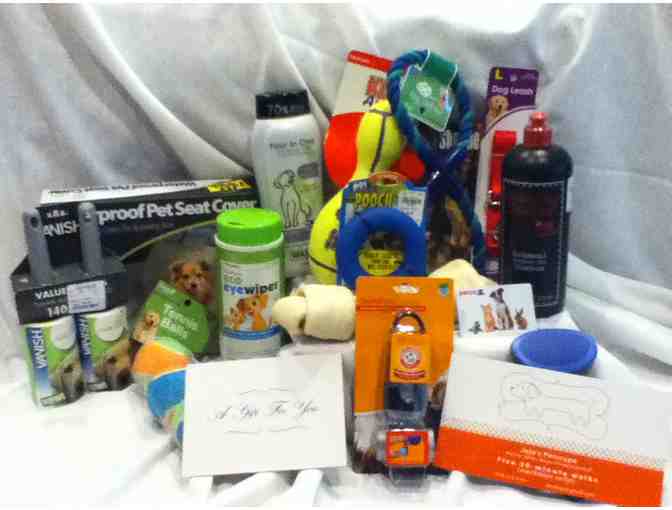 This Basket Includes: Purrs and Paws Mobile Pet Spa, 2 PetSmart Frisbees, $25 Petsmart Gift Card, Dog Shampoo/Conditioner, Dog Toy, Cat Brush, Dog Shampoo, Dog Toy, Dog Tennis Balls, Dog Leash, $20 Petco Gift Card, Rawhide Bone, Kong Airdog, JoJo's Petscape, Dog Calendar, Disposable Waste Bags with Dispenser, waterproof Pet Seat Cover, Eyewipes, Lint Rollers