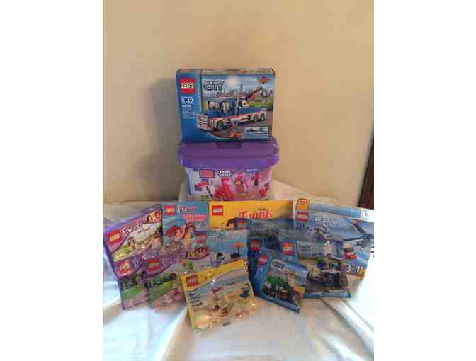 This Basket Includes: Mega Bloks Create n Play, Lego City Tow Truck, Lego Creator Twinblade Adventures, Lego Friends, Emma, Lego Friends Book, (4) Lego City bags, (1) Lego Creator Bag, (1) Lego Bag, (2) Lego Friends Bag, "Thank You" bag