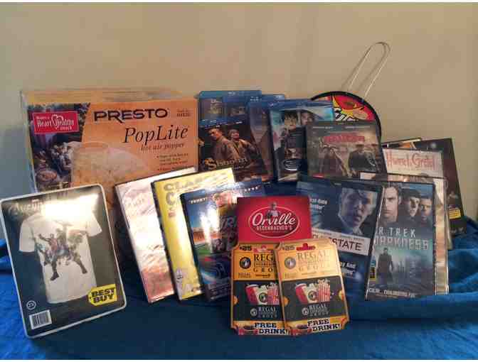 This Basket Includes: Popcorn Maker, Classic Cartoon DVD, An American In Paris DVD, Jiffy Pop, Microwave Popcorn, 2 $25 Regal Entertainment Gift Cards, Shaolin DVD,CinderellaIII-A Twist in Time, Hansel&Gretel, Star Trek Into Darkness, Pain & Gain, The Fifth Estate, The Hoax, The Lone Ranger, Blu-Ray DVDs: The Rocketeer,The Hitchhiker's Guide to the Galaxy, Dinosaur, Bridge to Terabitha, Thor The Underworld Poster, Movie Tickets, 4 Avengers T-Shirts(M,L, XL, 2X).