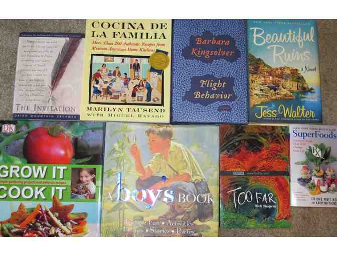- & now the books; Flight Behavior, Too Far (both new); Cocina De La Familia, Grow It Cook It, Beautiful Ruins, Boy's Book, The Invitation, Superfoods (last 7 books gently used)