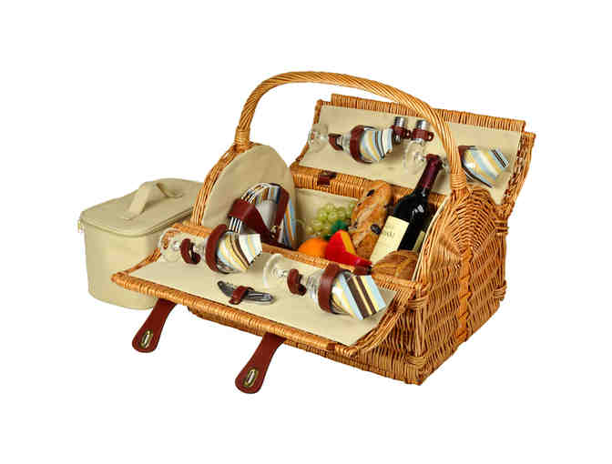 Product Features Unique hand crafted deluxe picnic basket in full reed willow with attractive dome top shape & top carry handle. Includes a premium picnic set for four with ceramic plates, matching cotton napkins, glass wine glasses, stainless steel flatware, corkscrew, and no spill salt & pepper shakers. Also includes a convenient food cooler. |