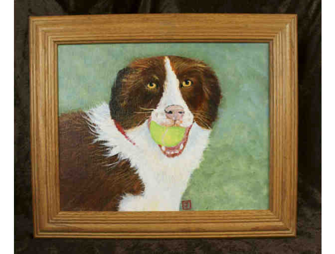 This original painting by Jeanne Hamilton captures a dogs love for their ball. Wood frame.