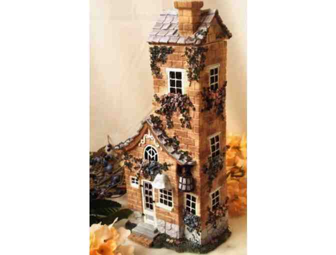 Ivy & Innocence "Towering Cottage" Numbered! - This is a hand numbered, limited edition piece from the "Ivy & Innocence" collection by artist Susan Reader. The whimsical Ivy building features turn-of-the-century cottage, hand-painted in soft pastel. The roof of the house lifts off for a deep well storage of pens, pencils, keys, money, or anything that will fit in the 5" deep space. Cottage measures 9 1/4" tall x 4" wide. Stone resin, and comes in atractive color gift box.