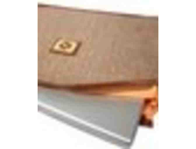 A natural woven laptop case with leather trim details and gold logo plate. Bag is padded and lined with orange.