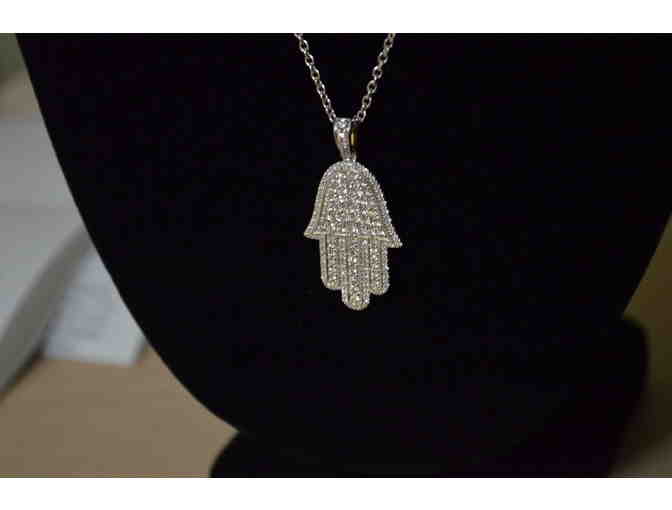 This gorgeous 14k White Gold Hamsa pendant has 115 Pave set diamonds weighing 1.58 cts. G-H color. VS2-S11 clarity on a 14k white gold 20" chain. Comes with an appraisal of $4500.
