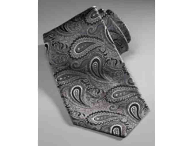 Italian silk tie and handkerchief set in a grey paisley pattern from Brioni Beverly Hills.
