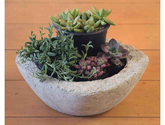 Unique planter is made of concrete with embedded moss, with beautiful succulents, lovingly created by WSP's fifth grade class.