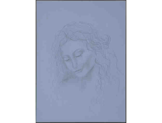 The 10.5” x 13.5” drawing is matted and balanced with a 19” x 23” contemporary silver frame.