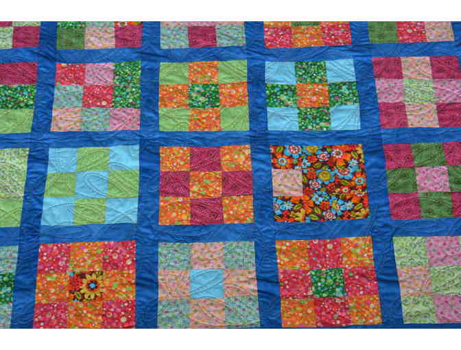 There are 6 rows with 4, 9x9 inch squares and the border is made from bright orange fabric with a swirly pattern. The backing of the quilt is a bright yellow fabric with a geometric flower pattern.