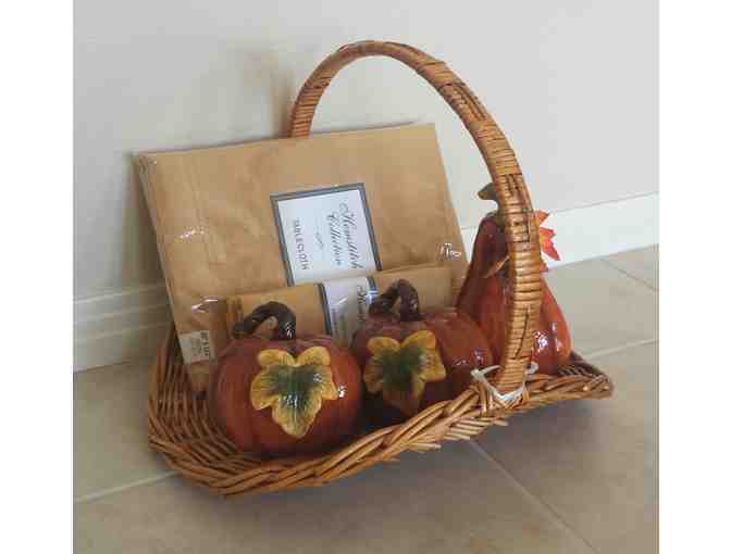 Everyone loves a beautifully set table to give thanks! Enjoy three beautiful ceramic pumpkins and lovely fall tablecloth (60"x102") and napkins all set in an open, wovenbasket.