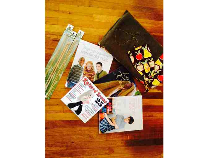This basket includes 3 sets of made in Japan bamboo knitting needles (size 2, 4 and 5), 4 knitting books- Knitted Icons, The Yarn Girls Guide to Knits for Older Kids, Knitting Everyday Finery and Lacy Knits. And Momma made wool felt/ cotton project bag beautifully made by OCS mom Abigail Cottrell.