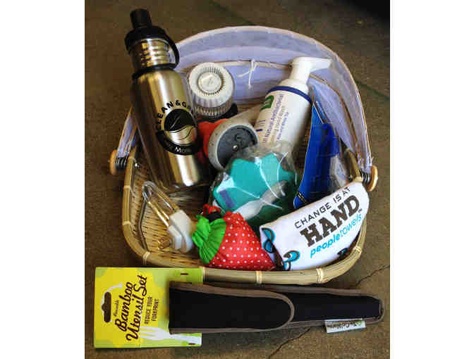 Included items: stainless steel water bottle and straw, Bamboo utensil kit, reusable napkin, travel size reusable bag, Clean Well soap, water saving shower head, shower timer, garden hose nozzle, Bike reflective tape, bike repair kit, and tire gauge.