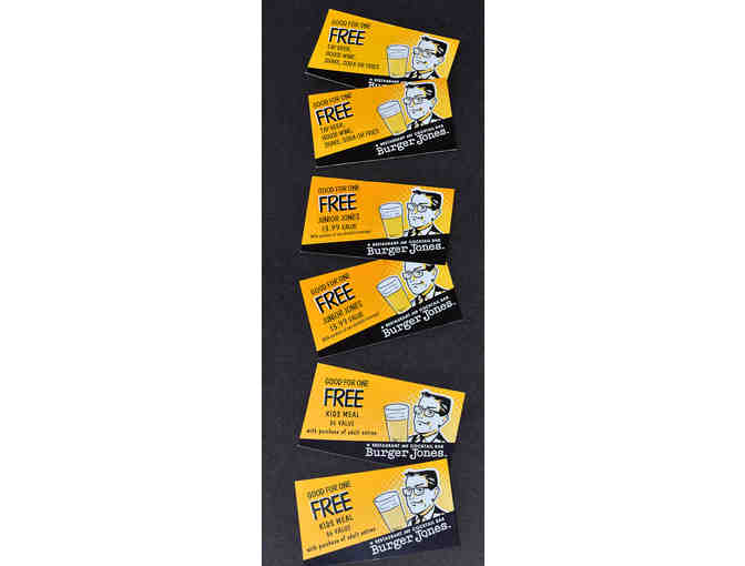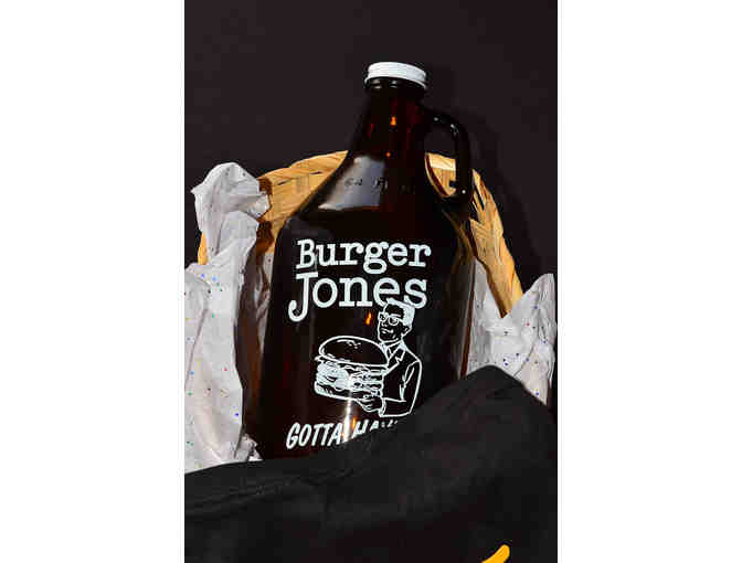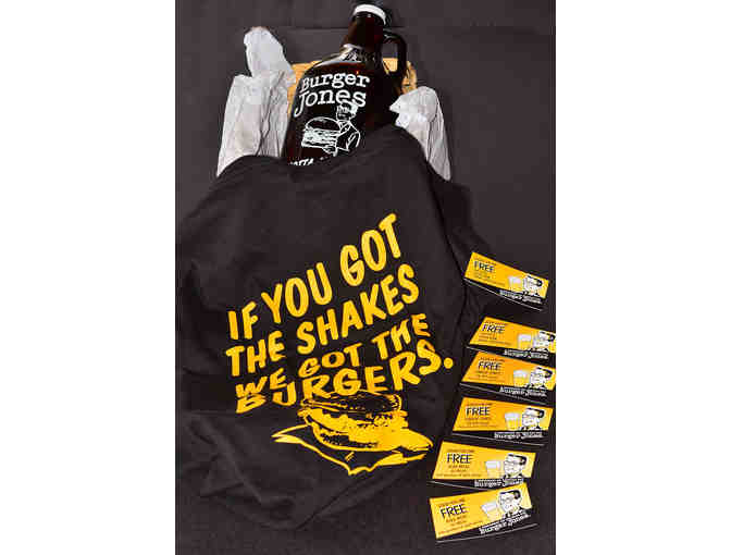 Package includes assorted gift cards for kids meals and, for both kids and adult beverages, plus an attractive Lady's extra long T-shirt and a Burger Jones "Gottas Have it" 64 oz Little Brown Jug! Great Bargain & Fun Stuff