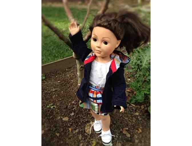 Dress your American Girl or Boy with campus style! With a great duffle coat and matching skirt or pants created exclusively for your doll by Crocker Mom Beth Detwiler, they will be ready to lead the debate team, edit the school newspaper, or ace that physics test. Winning bidder can choose either blue or tan coat, with a palate of fabric options for skirt or pants that match the hood lining. Insanely cute.