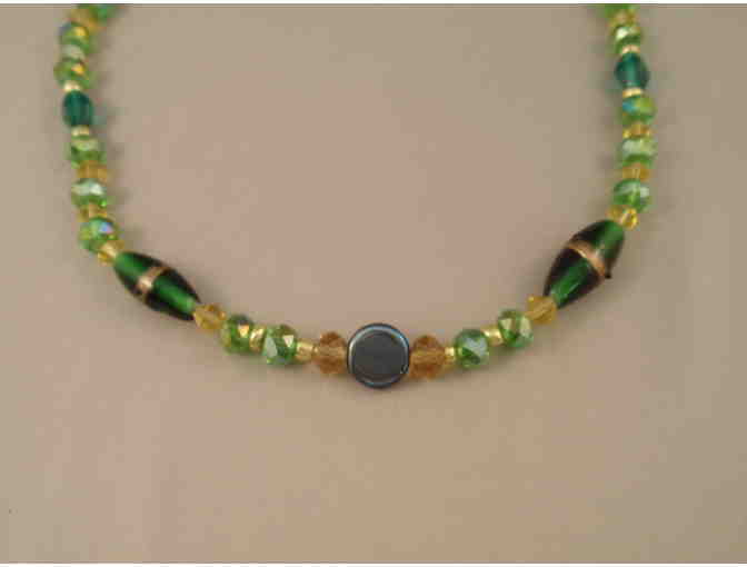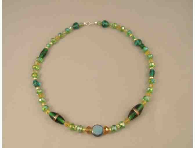 Sparkling necklace accented with green art glass beads from India, surrounded by fern green, light topaz, and sunflower colored Swarovski crystal beads. Silver springring closure. A true one-of-a-kind piece of jewelry created by artist Wynn Shafer.