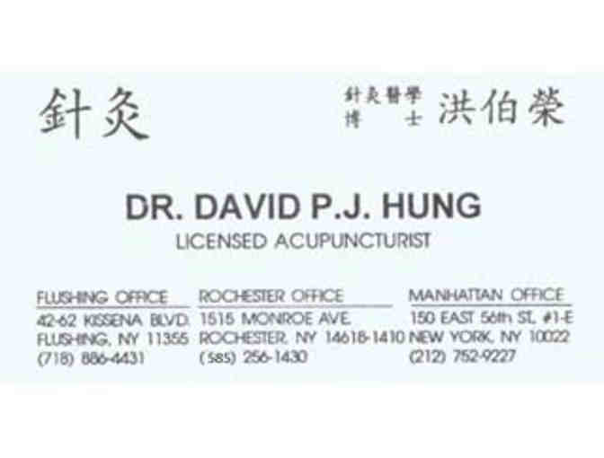 Discover what one acupuncture treatment from David Hung, Licensed Acupuncturist, will do. Treatment may assist in coping with pain, allergies, colitis, and/or appetite- and smoking-control. Dr. Hung has 48 years of experience and was trained in the Orient. The National Health Institute now advocates acupuncture treatment for certain conditions. The office is open on Wednesdays and Thursdays. An appointment is required. This item is only available for new patients.