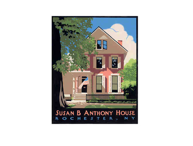 WXXI is proud to welcome back Featured Artist, Laura Wilder! With her exquisite painting, SUSAN B. ANTHONY HOUSE, Laura invites us to celebrate the life of Rochesters legendary American civil rights leader. The stunning view of Susan B.s home on Madison Street comes to life in lovely shades of salmon, tan, green and blue. Each viewing delights by revealing exquisite details, enlivened by the play of light and shadow from patterns in the landscape to reflections on the windowpanes. You might expect to see Susan B. herself step out onto the porch. What an exciting way to celebrate Susan B. Anthonys lifelong struggle to win voting rights for women and equal rights for all - with Lauras marvelous painting! Lauras unique and award-winning style is inspired by the great poster makers of then and now. After working as an art director, graphic designer and advertising illustrator, Laura Wilder left the commercial art world to start her own business, creating beautiful handmade prints, paintings, and portraits. The original painting is signed on the back with a note, matted in white, and mounted under glass in a handsome dark brown wood frame with gold fillet. This print is a signed, numbered & unframed print. Dimensions 18.5'' x 24''.