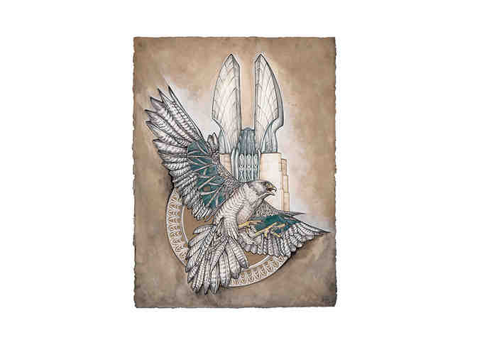 Breathtaking is the only word to describe this original artwork titled ''Wings of Progress'' by WXXI Auction New Featured Artist Sarah C. Rutherford. Completed with a combination of techniques, including watercolor, illustration and collage this one of a kind artwork commands your attention the moment you walk in the room. As an added bit of interest, the inside wings of the falcon, highlighted in the center of the artwork, feature pieces of the original blueprint for the Times Square Building from 1929.