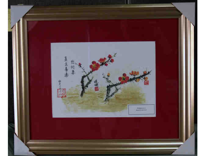 Local artist, Madeline Hsaio, offers her beautiful Chinese ink painting REJOICE. In her image focusing on bright red flowers blossoming along leafless branches, the artist has incorporated Chinese calligraphy to convey the words from Phillippians 3:1 Rejoice in the Lord. The message is also written in English. Red artists seals add a touch of beauty and authenticity. The painting is matted in dark red, and mounted behind plexiglass in a handsome sculpted black frame that measures 23 inches by 19 inches. Bid high and enjoy this exquisite Chinese ink painting in your home or office!