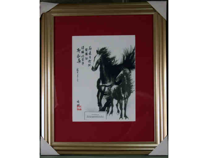 Local artist, Madeline Hsaio, offers her beautiful Chinese ink painting BATTLE HORSE. In her image focusing on a pair of horses, the artist has incorporated Chinese calligraphy to convey the words of Proverbs 21:31 The horse is prepared for the day of battle, but deliverance is of the Lord. The message is also written in English. A red artists seal adds a touch of beauty and authenticity. The painting is matted in dark red, and mounted behind plexiglass in a handsome sculpted black frame that measures 19 inches by 23.25 inches. Bid high and enjoy this exquisite Chinese ink painting in your home or office!