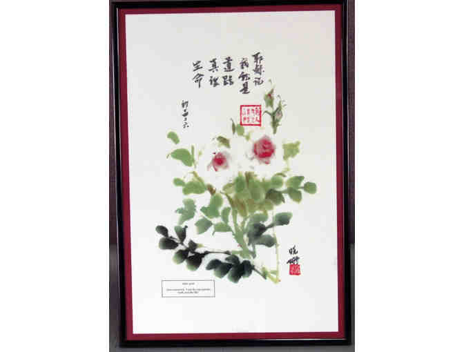 Local artist, Madeline Hsaio, offers her beautiful Chinese ink painting I AM THE WAY. In her image focusing on two red roses blossoming on a branch with thorns, the artist has incorporated Chinese calligraphy to convey the words of John 14:6, Jesus answered, I am the way and the truth, and the life. The message is also written in English. A red artists seals add a touch of beauty and authenticity. The painting is matted in dark red, and mounted behind plexiglass in a handsome contemporary black frame that measures 12.5 inches by 18 inches. Bid high and enjoy this exquisite Chinese ink painting in your home or office!
