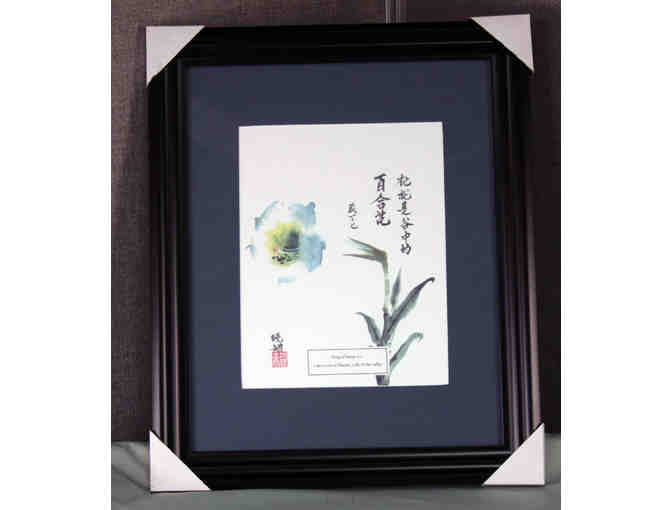 Local artist, Madeline Hsaio, offers her beautiful Chinese ink painting ROSE OF SHARON. In her image focusing on a single while lily blossom, the artist has incorporated Chinese calligraphy to convey the words from Song of Songs 2:1 I am a rose of Sharon, a lily of the valley. The message is also written in English. A red artists seal adds a touch of beauty and authenticity. The painting is matted in dark green, and mounted behind plexiglass in a handsome matte black wood-grained frame that measures 19.25 inches by 23 inches. Bid high and enjoy this exquisite Chinese ink painting in your home or office!