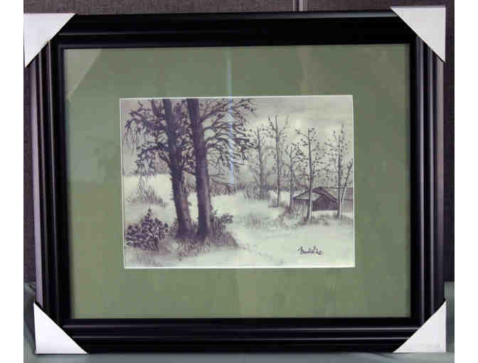 Local artist, Madeline Hsaio, offers her beautiful Chinese ink painting PEACEFUL HOME. Her serene image focuses on a modest home nestled among green trees and grasses. The artists signature appears in the lower right. The painting is matted in soft green, and mounted behind plexiglass in a handsome sculpted black frame that measures 23 inches by 19.25 inches. Bid high and enjoy this exquisite Chinese ink painting in your home or office!