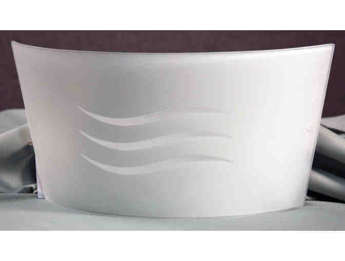 MAYNARDS ELECTRIC OFFERS THIS CONTEMPORARY WALL SCONCE IN WHITE WITH ETCHED GLASS LINES. THE SCONCE IS 16'' WIDE BY 11'' HIGH AND CARRIES A 150-WATT MEDIUM-BASE BULB