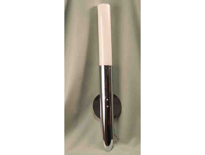 MAYNARDS ELECTRIC OFFERS A CONTEMPORARY WALL TORCH IN POLISHED NICKEL WITH OPAL WHITE GLASS. ONLY 3'' WIDE, IT IS 23'' TALL AND CARRIES A 50-WATT MR16 BIPIN LAMP.