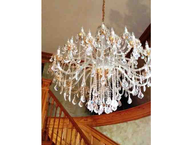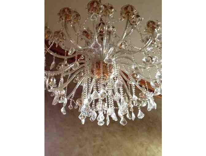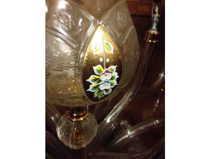 Wow, is the only word to describe this absolutely stunning quality crystal chandelier offered by a friend of WXXI. Featuring hand painted decoration, gold gilding and numerous crystal drops and beaded chains, the chandelier's many prisms capture and reflect the light from every angle. Measuring approximately 48'' x 48'' this chandelier is perfect for an entry way or room with cathedral ceilings. Imported from Italy in 2007 to Farinelli of San Francisco-a renowned up-scale boutique known for their high-quality crystal chandeliers, you can be sure this chandelier is of the highest quality.