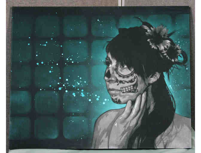 Local artist, Mr. Prvrt offers a stencil and spraypaint portrait on wood, SACCHARO CALVARIUM (Sugar Skull). Bid high and discover how beautiful the darkness can be! Celebrating morbid beauty, the piece focuses on a beautiful young woman whose long black hair has been done up with flowers. Her tattooed face exposes a set of skeletal teeth on her cheek. The artist has chosen gray, teal, and black to carry out his theme. This signed, Frosty Edition measures 30 x 24 inches.