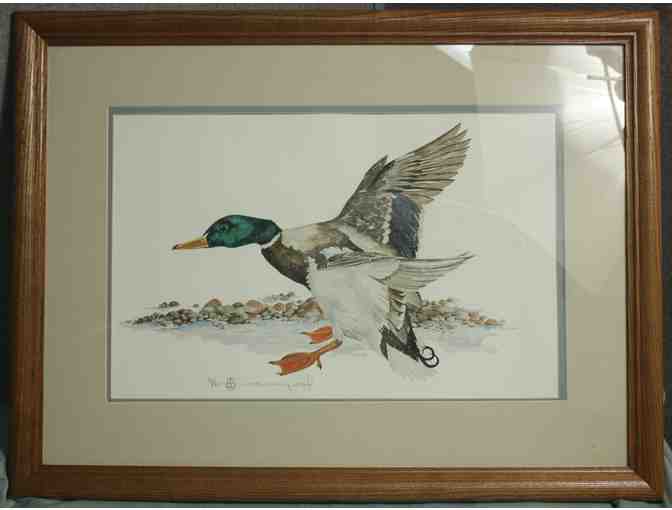 Michele Conley Vogel, a well known artist from East Aurora, NY painted this duck coming in for a landing on water. It is number 95 out of 750. It is an oak frame.