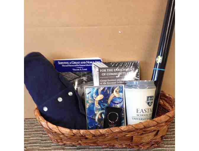 Eastman School of Music is pleased to donate a gift basket that includes the following Eastman-branded items: Book (paperback copy) - For the Enrichment of Community Life: George Eastman and the Founding of the Eastman School of Music by Vincent A. Lenti; Book (paperback copy) - Serving a Great and Noble Art: Howard Hanson and the Eastman School of Music by Vincent A. Lenti; New Eastman East Wing Poster; Great Jazz Plays at Eastman Poster; Short-Sleeved Polo Shirt; Box of 10 Notecards w/envelopes; Travel Coffee Mug; Keychain. Bid high and show your support for the Eastman School of Music!