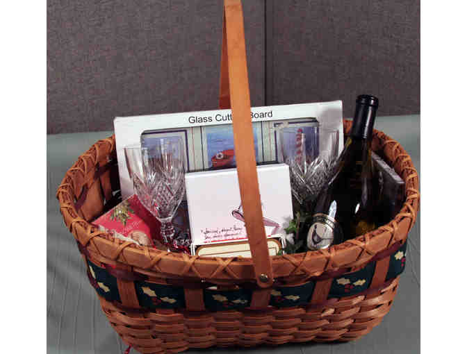 Trudy Bartleson offers a large Holiday Gift Basket. Bid high for a collection of thoughtful gifts, just right for any occasion. Included are: two long stemmed wine glasses to go with a bottle of white wine Game Bird White from Heron Hill Vineyards, a glass cutting board featuring outdoor beach scenes, a Kristin Chenoweth CD A Lovely Way to Spend Christmas, Wynton Marsalis CD Selections From Swinging Into the 21st, a decorative green colored candle holder with a Yankee Candle Honeydew Melon candle votive inside, a cute folk art Santa with a sack of twigs decoration, six acrylic cork backed coaster set from Pimpernel featuring meadow flowers, and a 5 porcelain mug entitled Book Worm. The large basket is 14 (w) x 16.5 (l) x 8 (h) has a tall handle. Around the top of the basket is a green band featuring red holly berries and gold leaves. So many lovely gifts, it's like opening your Christmas stocking!