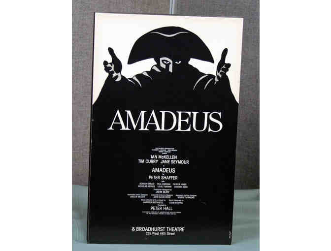 Relive the glory days of Broadway with this plak mounted poster of the 1981 Tony Award winning play, Amadeus starring Sir Ian McKellen, Tim Curry & Jane Seymour. Measures 22'' x 16''.